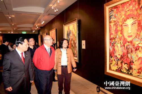2月1日,中国国民党荣誉主席吴伯雄在全国台联会长梁国扬陪同下参观了在台北市孙中山纪念馆展出的国粹油画精品。 (中国台湾网 田云鹏 摄)