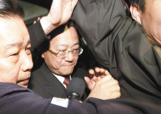 台检方特侦组约谈台新金董事长吴东亮(中),昨天凌晨结束约谈后,吴东亮由多名保镳护卫步出特侦组,闭口不回应媒体问题。(图:台湾《联合报》)