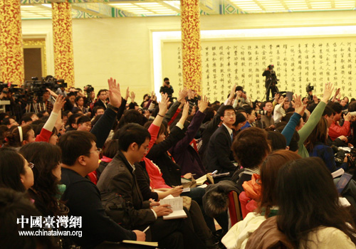 2日下午,全国政协十一届三次会议召开首场新闻发布会。图为发布会现场记者踊跃发言提问。(中国台湾网 张弛 摄)