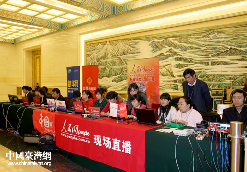 2日下午,全国政协十一届三次会议召开首场新闻发布会。图为网络直播台。(中国台湾网 高斯斯 摄)
