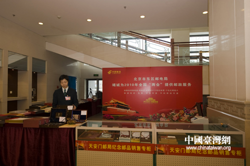 东城区邮电局北苑邮电支局孟荣翠局长亲自到北京会议中心全力做好保障工作,为政协委员准备了虎生肖和钱币等几百种邮品,她告诉记者,十一届全国人大三次会议和全国政协十一届三次会议首日封于2日今晚开始发行。(中国台湾网 肖春阳 刘洋 摄)