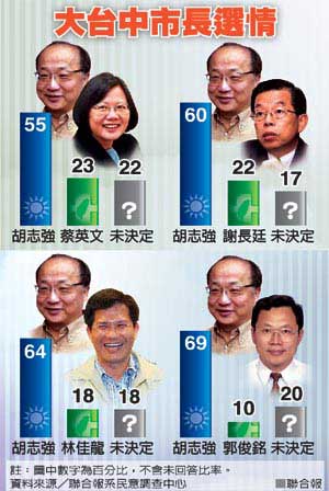 调查发现,年底大台中市长选举,如果未来国民党推出胡志强参选,民进党若由蔡英文迎战,目前胡志强以55%的支持率领先,蔡英文获得23%的选民支持,22%未决定;假设民进党由谢长廷出马与胡志强竞逐,则胡志强支持率增为60%,22%选民属意谢长廷,17%未决定;若民进党由林佳龙披战袍,胡志强暂以64%支持率超前林佳龙的18%;如由郭俊铭代表民进党,则胡志强领先幅度更扩大,以69%支持率超出郭俊铭59个百分点。