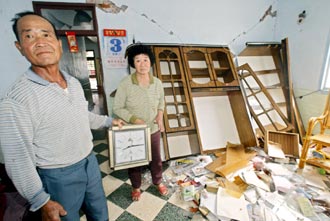 高雄县甲仙昨天发生规模6.4级地震,杉林乡受损严重,全倒及半倒民宅有30多间。一名民众手里拿着停止走动的时钟,心有余悸地描述地震发生时的情形。来源:台湾《联合报》