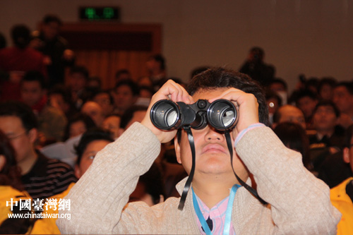 全国人大十一届三次会议上使用新型武器-望远镜的记者 (中国台湾网 徐维彬 摄)