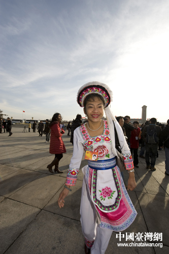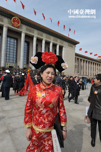 全国人大代表、满族的那辉满族装束惊艳亮相人民大会堂。(中国台湾网发 肖春阳、刘洋摄) 来自部队的女委员走出人民大会堂微笑着和记者打招呼。 (中国台湾网发 肖春阳、刘洋摄) 来自云南的全国人大代表王瑛满脸笑容走向人民大会堂。 (中国台湾网发 肖春阳、刘洋摄)
