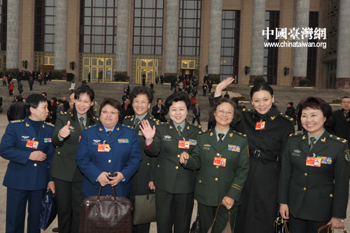来自部队的女委员走出人民大会堂微笑着和记者打招呼。 (中国台湾网发 肖春阳、刘洋摄)
