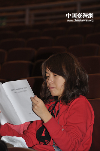 中国汽车报的美女记者在阅读大会发言材料。 (中国台湾网发 肖春阳、刘洋)