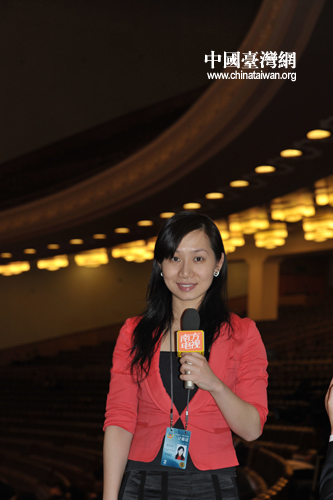 南方电视的美女记者在大会堂进行现场报道。 (中国台湾网发 肖春阳、刘洋)