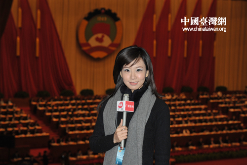 广州电视台的美女主播在人民大会堂现场播报。 (中国台湾网发 肖春阳、刘洋)