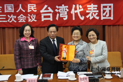 图为全国人大代表、中华全国台湾同胞联谊会会长梁国扬向台湾代表团台籍女代表赠送节日礼物 (中国台湾网 徐维彬 摄)