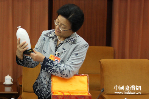 图为台籍女代表魏丽惠欣赏节日赠礼,她表示这是份精致的礼物十分珍贵、贴心。 (中国台湾网 徐维彬 摄)