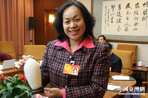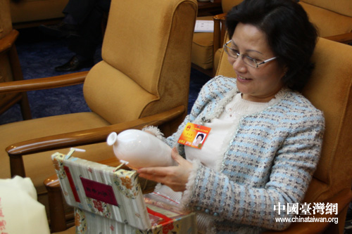 图为台籍女代表陈云英对节日礼物爱不释手 (中国台湾网 徐维彬 摄)