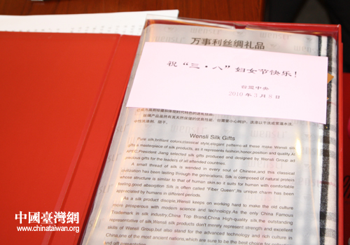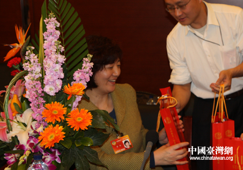 庆祝“三八”国际劳动妇女节,台盟中央向台籍女委员赠送节日礼物。(中国台湾网 张弛 摄)
