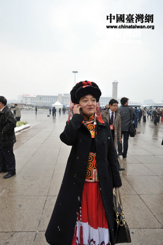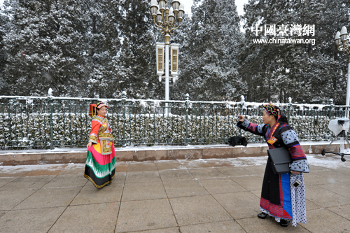来自基层贫困地区的全国人大代表、贵州省六盘水市六枝特区牛场乡副乡长罗涛为同伴在雪中拍照留念(肖春阳、刘洋摄影报道)