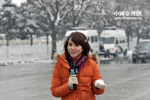 来自澳门的记者第一次见到下雪,在做现场报道的时候,手抓一把雪通过摄像机“传”回澳门。(中国台湾网发 肖春阳、刘洋摄)