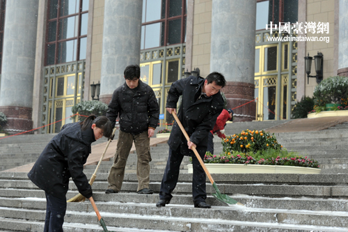 工作人员忙着清扫积雪。 (中国台湾网发 肖春阳、刘洋摄)