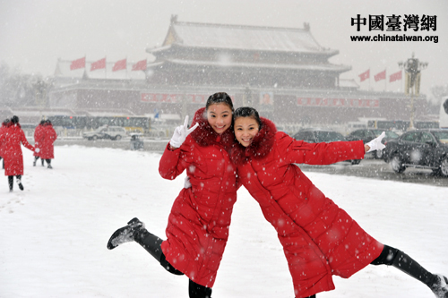 礼仪小姐兴奋的映雪起舞。 (中国台湾网发 肖春阳、刘洋摄)
