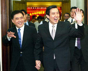 马英九和台北市长郝龙斌近日参加台军退役将领春节联谊餐会,把酒言欢后手牵手走出“胜利厅”。图片来源:台湾《联合报》