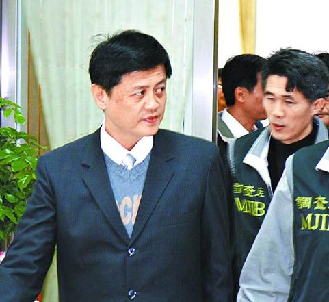 嘉义市议会议长林承勋(左),昨被调查员带回,讯后遭收押。(图:台湾《苹果日报》)