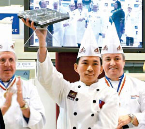 台湾面包师傅吴宝春(中)10日在法国乐斯福杯面包大赛首届面包大师个人赛,获得面包大师头衔。图片来源:台湾《联合报》