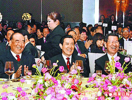 昨天到场的国民党高层们“喝开了”,几乎每个人脸上都红通通的。马英九待到8时30分才由主婚人连战亲送下楼,有说有笑。王金平离开时也表示很尽兴。