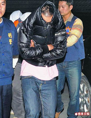 台警方昨晚带回涉嫌砍死人的嫌犯、台军现役军人刘原汶(中)等5嫌犯漏夜侦讯。 来源:台湾《苹果日报》