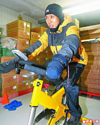 陈彦博昨日在超市冷冻库骑飞轮,加强心肺功能训练。 来源:台湾《苹果日报》