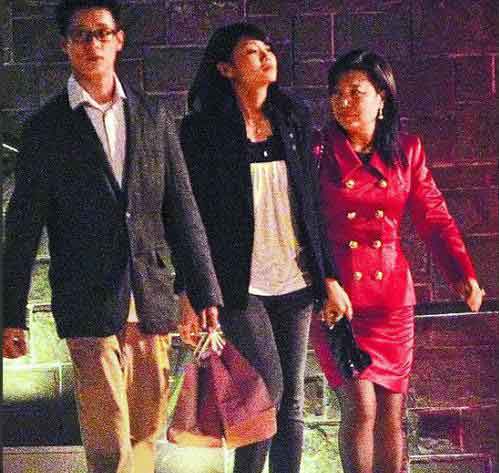 婚宴结束,蒋友青(左)、长腿妹和妈妈蒋方智怡准备搭车离去。图片来源:台湾《苹果日报》