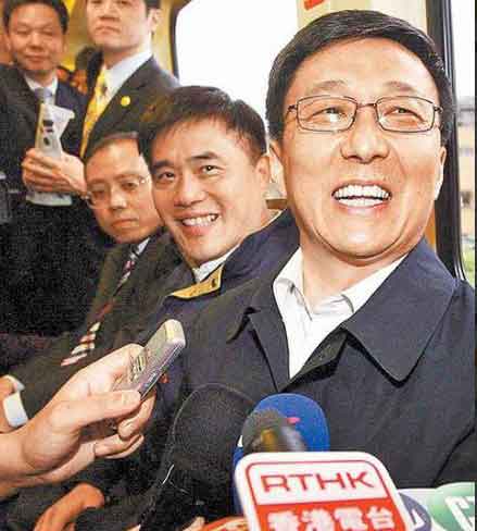 韩正(右)昨与郝龙斌(右2)首次搭台北捷运体验庶民文化,心情愉快。图片来源:台湾《苹果日报》
