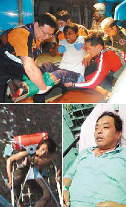 目前,受伤的“正升丰号”船长蔡清隆和两名印度尼西亚渔工,在被台湾搜救中心的直升机救起后,已经由救护车送往医院救治。据了解,船长的弟弟即轮机长蔡保明和另外两名印度尼西亚渔工仍下落不明。蔡清隆说,失踪的3人身上都携带有信号弹,若搜救直升机和舰艇靠近,3人应该会立即点燃信号弹,现在距离失事不过才10几个小时,3人生存机率的还很大。