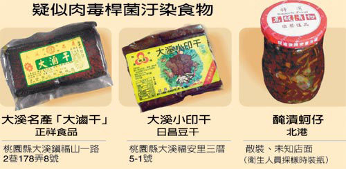 台当局“卫生署”表示,3年前曾有一名67岁老人不幸肉毒杆菌中毒死亡病例。本周二才发布今年首起肉毒杆菌群聚中毒事件,是一对桃园县母女食用真空包装素豆干、素蹄筋、素肚而中毒,仍在插管治疗,昨晚再发布另一对婆媳疑似中毒,中毒的是72岁婆婆郑玉兰和46岁媳妇蔡锦如。