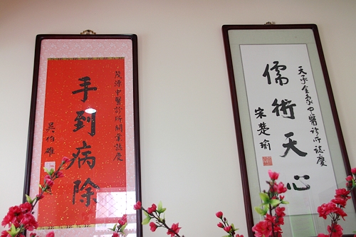 宋楚瑜与吴伯雄分别为诊所题字。(中国台湾网 马迪 摄)