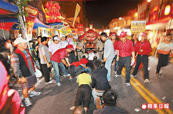 大甲镇澜宫妈祖銮驾绕境时,信徒争相钻轿底祈福。 来源:台湾《苹果日报》