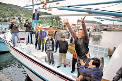 用日本巡逻舰撞沉“联合”号海钓船赔偿金加上朋友借贷,船长何鸿义打造亿顺168号昨首航到深澳渔港。图为何船长撒麻糬分享迎新船重返大海的喜悦。(图片来源:台湾《中国时报》)