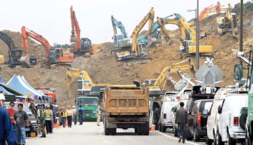 昨天是台湾三号高速公路基隆七堵段山体滑坡后的第一个上班日,救灾单位在现场加派机具进场,全力开挖,山头上满是挖土机,全力寻找任何可能的生机。