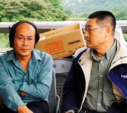 两位焦急的父亲,李锡昌(左)、郭恒龙(右)的子女可能被山崩掩埋,两人在现场只能等待和互相打气。图片来源:台湾《联合报》