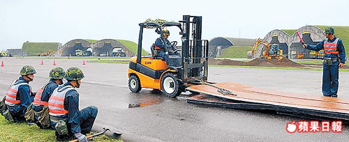 台军演练飞机跑道被毁时,以铺设玻璃纤维板来抢救。来源:台湾《苹果日报》