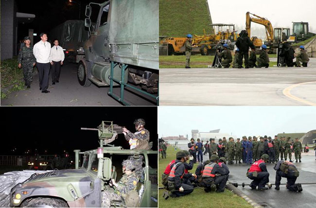 台当局“国防部长”高华柱29日晚间视察战术机动情况(左上)。台空军花莲基地27日实兵演练(右上)。台军陆战六六旅29日晚间演戏战力保存战术,往南机动执行“跨区增援”任务(左下)。台空军花莲基地,27日台军参谋总长林镇夷视察官兵操演实况(右下)。