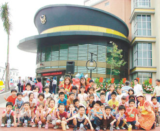 台南县新化警分局新建办公厅舍昨天落成,戴警帽造型独一无二,幼儿园小朋友参观觉得新奇有趣。图片来源:台湾《联合报》