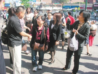 陈树菊(左二)在纽约法拉盛街头遇到热情民众跟她握手。