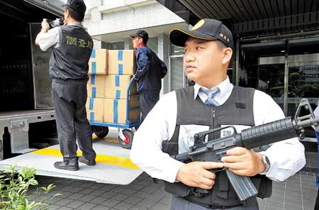 台当局“法务部调查局”5日进行年度销毁毒品作业,在“调查局”人员荷枪实弹保护下,将一箱箱毒品装上借自台湾银行的运钞车,前往木栅焚化炉进行销毁。图片来源:台湾《中国时报》