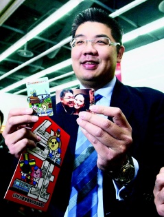 连战长子、悠游卡公司董事长连胜文将请辞,图为他出席icash悠游卡发卡仪式时,得意秀出私人订制的与太太蔡依珊合照的悠游卡。资料图片