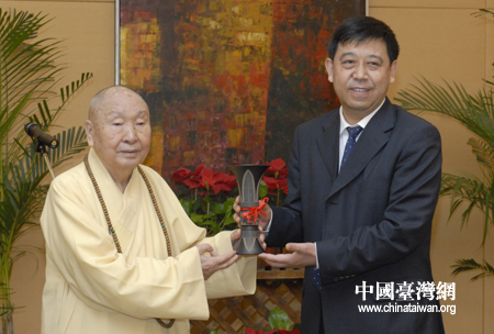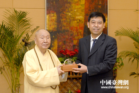 中国台湾网5月7日西安消息 5月6日晚,陕西省台办主任闫超英会见台湾中台禅寺惟觉长老率领的赴陕参访团一行。惟觉长老表示,两岸关系和平发展“百尺竿头更进一步”,还需要包括佛教界在内的两岸同胞共同努力。