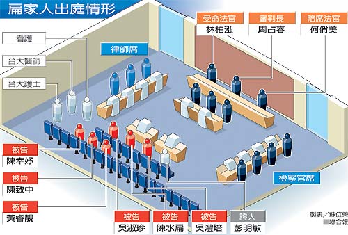合议庭昨天传讯“二次金改弊案”21名被告出庭,包括陈水扁、吴淑珍、陈致中、黄睿靓、陈幸妤、以及台湾金控业者国泰蔡镇宇、元大马志玲、马维建、马维辰父子、中信辜仲谅等人全部到庭,加上律师团成员,几乎挤爆整个法庭。