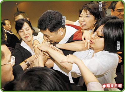 中国台湾网5月11日消息 据台湾《苹果日报》报道,台湾“立法院”国民党团昨强势动员,在“立院内政委员会”初审通过攸关采认大陆学历的“两岸人民关系条例”修正草案,会议主席张庆忠要主持会议,遭民进党民意代表林淑芬、陈亭妃强力阻挠,多名民意代表拉扯成一团(上图)。民进党民意代表邱议莹更情绪激动,拿起主席台上的法律参考书籍当场撕毁(下图)。(中国台湾网 高大林)