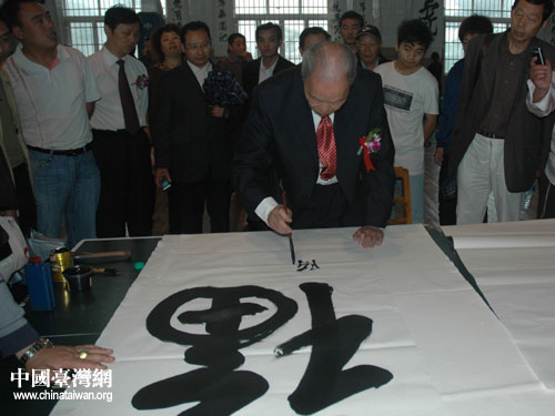 中国台湾网5月13日九江消息 5月8日,九江学院体育训练馆内,一位九旬老人现场泼墨疾书,一幅幅遒劲有力的“福”、“寿”等大字顷刻完成。这位动作矫健、思维清晰的老人,就是蜚声海内外的台湾著名学者、书法家、社会活动家,台湾名人李敖和连战的授业恩师——陈大络。
