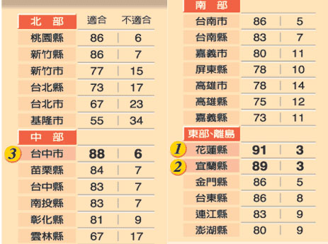台湾25县市适合居住度调查结果 来源:台湾《联合报》