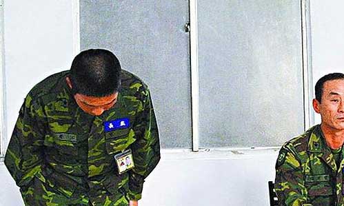 台陆军542旅旅长江声辉(左)为部属猥亵女排长事件,鞠躬致歉。资料图片