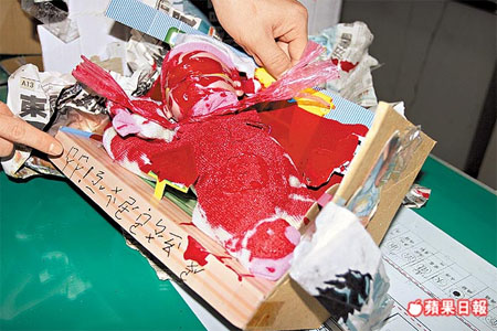 蔡姓男子寄送血腥娃娃给前女友,上面用注音符号写着“妈妈!你为什么不要我”。 来源:台湾《苹果日报》