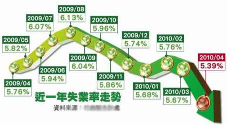 台“主计处”第四局副局长刘天赐说,上月失业率为5.39%,相当于59万3000人失业,创去年2月以来新低,单月下降幅度则是1994年10月以来最大的一次,显示厂商聘雇意愿大增,其中新增就业主要是制造业2万五5000人和营造业1万1000人。